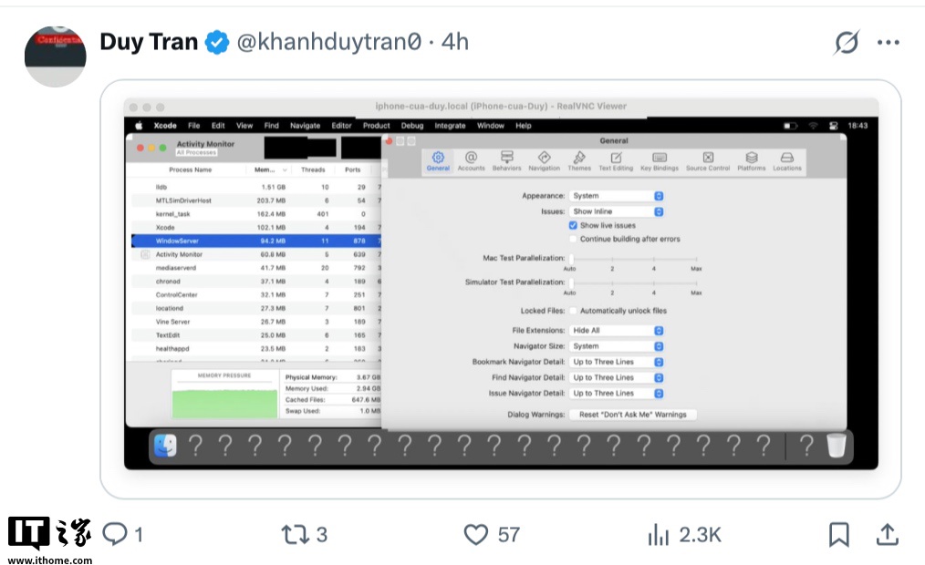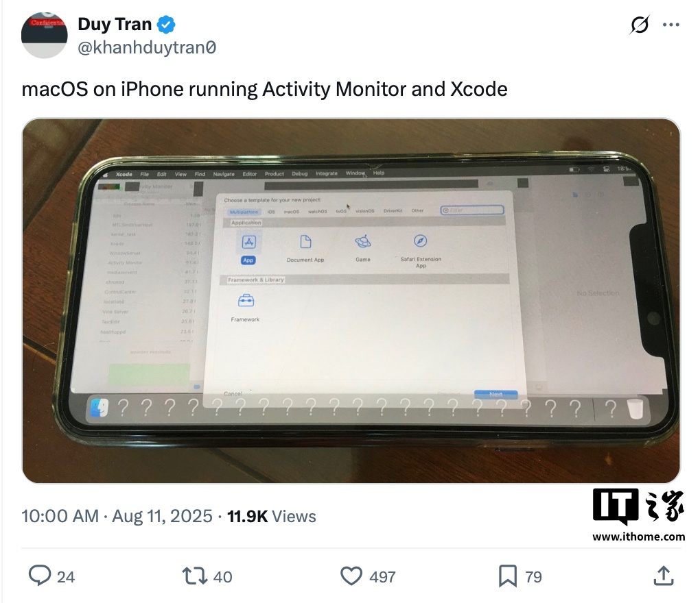 IT之家 8 月 11 日消息,博主 Duy Tran 在 X 发文,透露其成功在 iPhone 设备上运行了完整的 macOS 操作系统。根据其发布的演示内容,该系统不仅能够正常启动,还能运行 Xcode 和活动监视器等 GUI 应用。