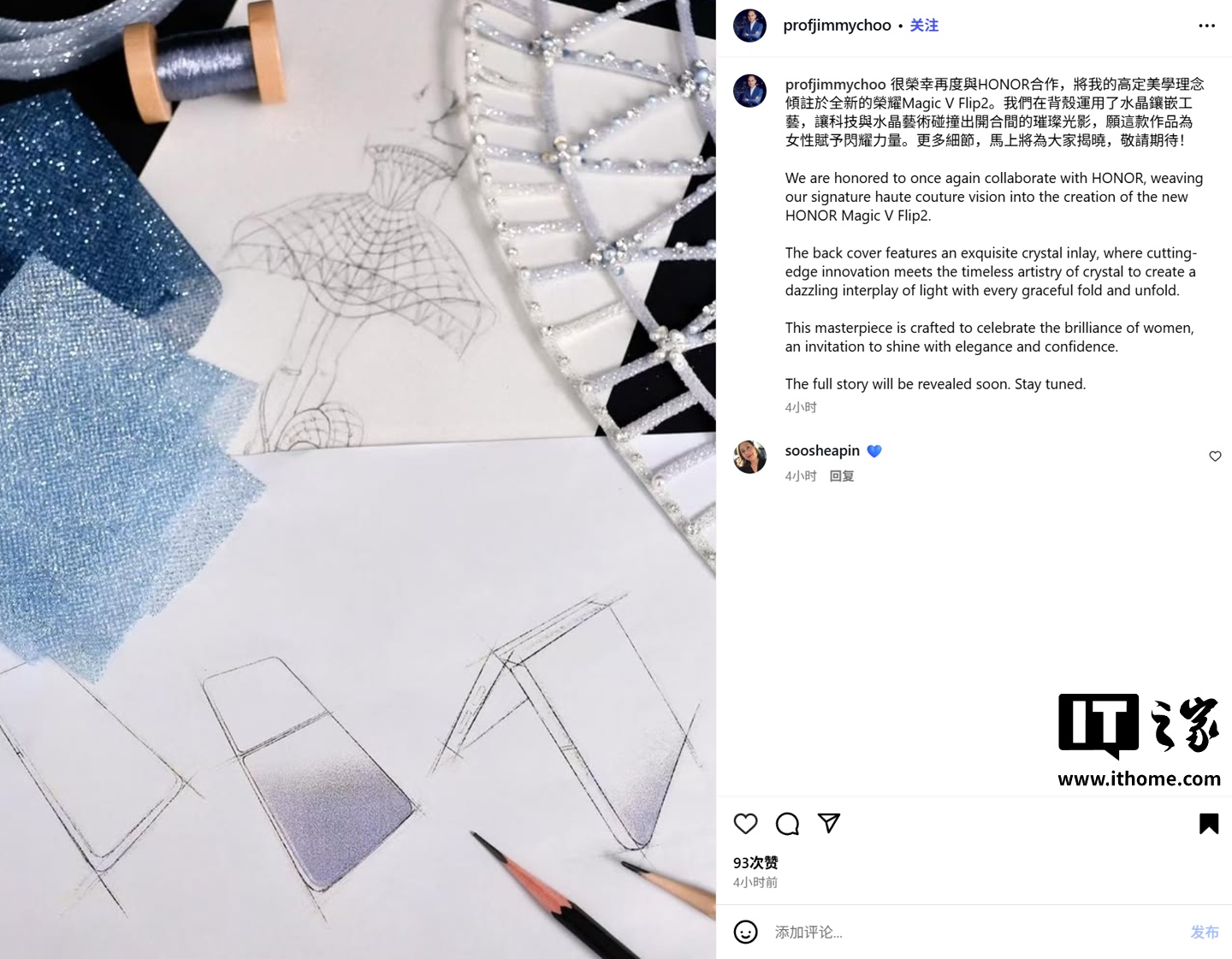 据IT之家今日早些时候报道,奢侈品品牌 Jimmy Choo 的 CEO 周仰杰今天在社媒 Instagram 表示,已与荣耀再次达成合作,将联手荣耀推出 Magic V Flip2 小折叠手机高定版。