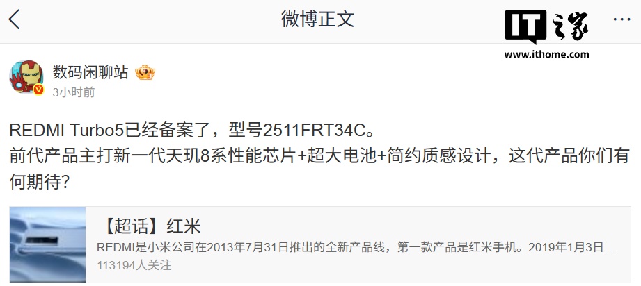 IT之家 8 月 11 日消息,博主 @数码闲聊站 今天在微博透露,小米 REDMI Turbo 5 手机已经备案。