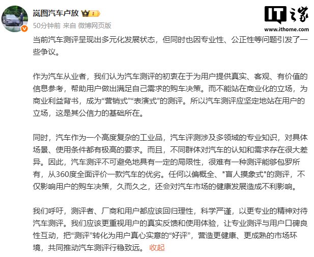 IT之家 8 月 11 日消息,岚图汽车 CEO 卢放今日发文称:“当前汽车测评呈现出多元化发展状态,但同时也因专业性、公正性等问题引发了一些争议。”