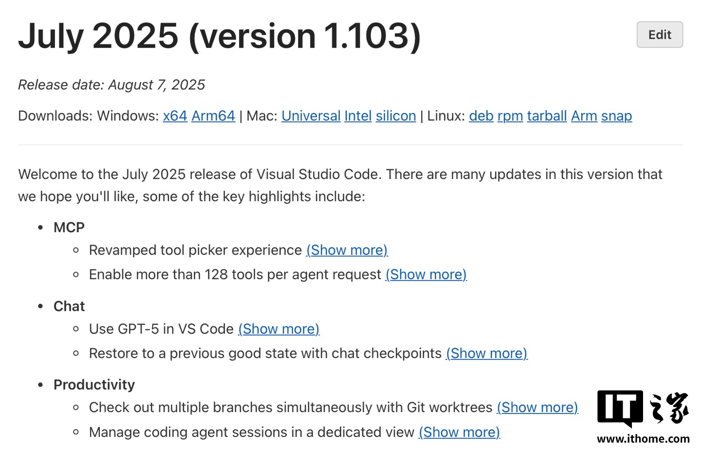 IT之家 8 月 11 日消息,微软现已正式发布 VS Code 1.103 版本,本次更新为聊天功能引入了 OpenAI 最新推出的 GPT-5 模型,同时引入“聊天检查点”、Git 工作树原生支持等特性。