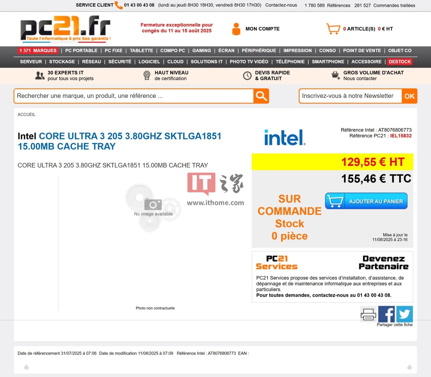 可以看到该处理器上市时间为 7 月 31 日,修改日期为 8 月 11 日,目前处于无货状态,不含税 (HT) 价格为 129.55 欧元,含税 (TTC) 价格为 155.46 欧元(IT之家注:现汇率分别约合 1083 元和 1299 元人民币)。