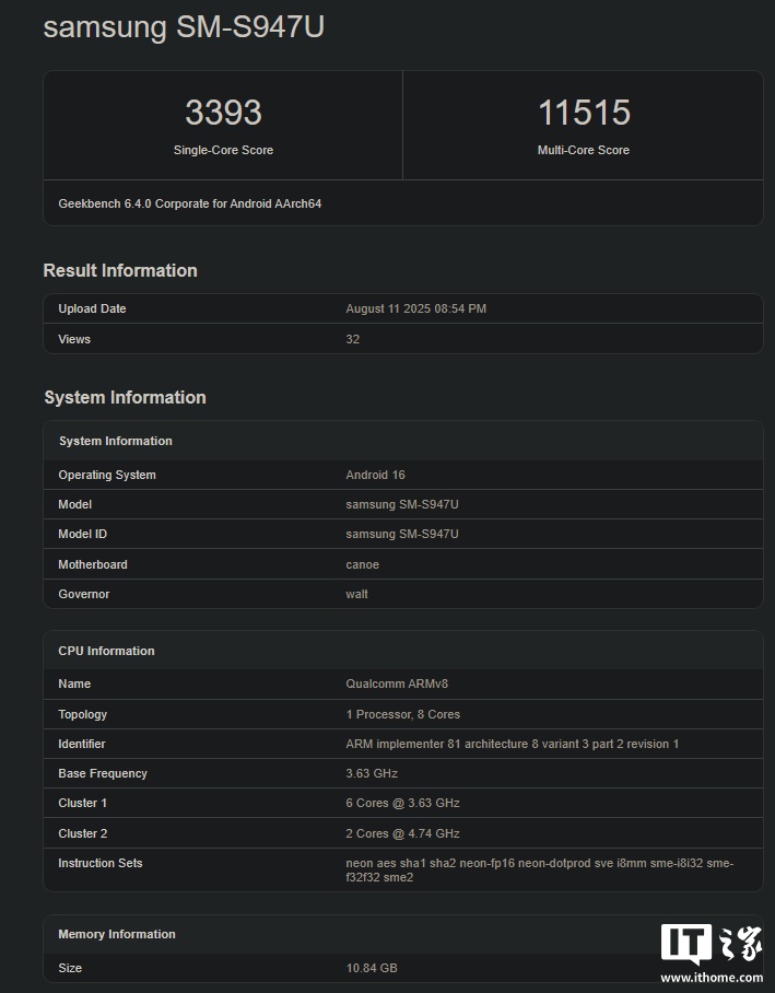 IT之家 8 月 12 日消息,经过数月的爆料、传闻和猜测,高通骁龙 8 Elite 2 处理器终于在 Geekbench 上现身,比高通计划在 9 月底正式发布的时间早了一个多月。同时,我们也得以一窥三星旗舰机型 Galaxy S26 Edge(代号 SM-S947U)的相关信息。因此,此次现身的芯片很可能是专为 Galaxy 系列定制的骁龙 8 Elite 2 For Galaxy。