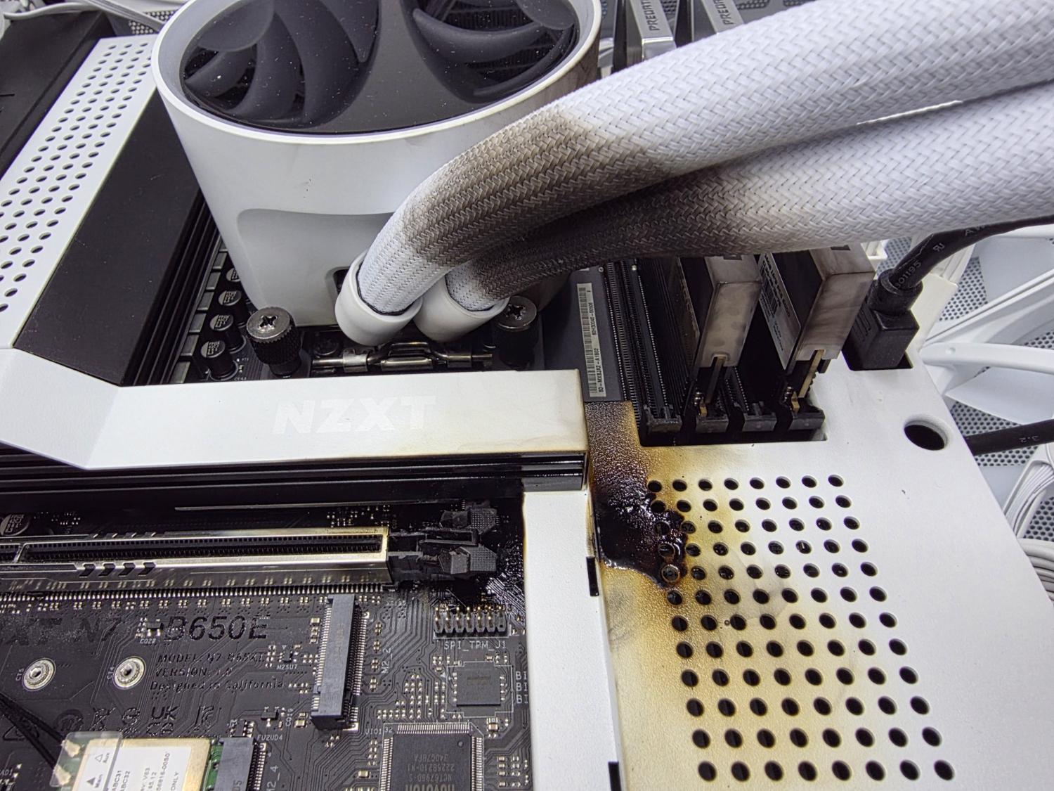 根据原帖描述,事发时系统出现卡死情况,随后机箱内冒出明火和烧焦气味,火焰持续约十秒,最终导致显卡严重烧毁,主板、SSD 及水冷管也受波及。