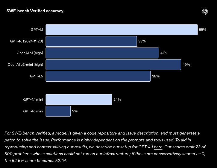 今年 4 月份发布 GPT-4.1 时,在同一基准仅使用 477 个问题下得得分在 54.6%。