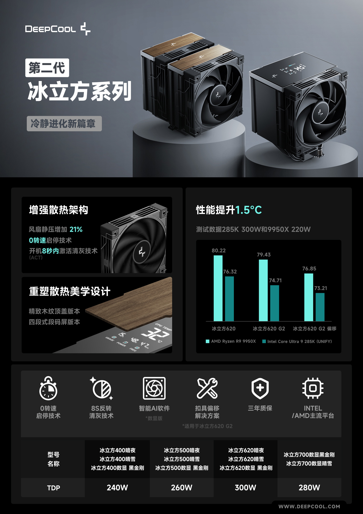 第二代冰立方风冷将覆盖现有冰立方系列的 400(单塔单风扇四热管)、500(单塔单风扇五热管)、620(双塔双风扇六热管)三个等级,并包含新的 700(单塔单风扇七热管)序列,标称 TDP 依次为 240W / 260W / 300W / 280W。
