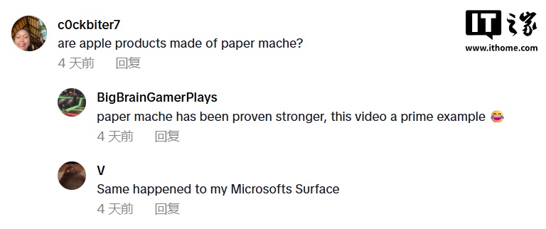 视频发出后,部分网友在评论区表示他们也遭遇过同样事故;同时也有部分网友对此认为“MacBook 的屏幕较为脆弱,不应该在笔记本键盘上放置任何东西”。