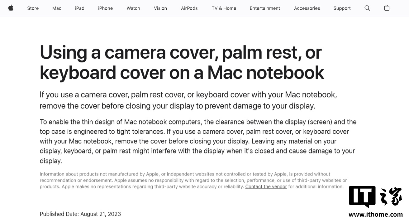 苹果还建议用户在合上 MacBook 前取下任何安置在笔记本屏幕 / 键盘面上的摄像头防窥贴、掌托或键盘膜,这些物品可能会在合盖时妨碍屏幕正常盖紧,导致屏幕损坏。
