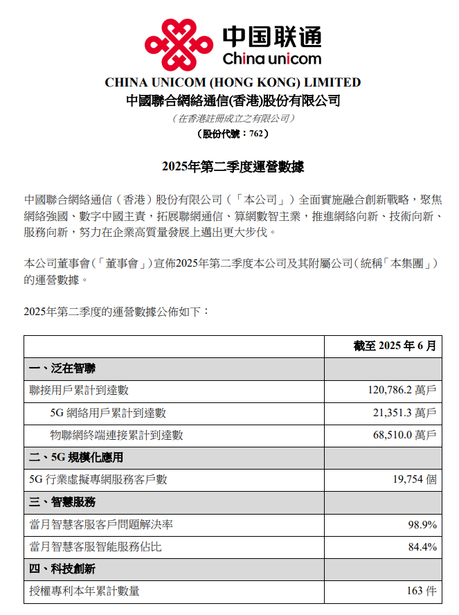 截至今年 6 月底,中国联通大联接用户累计 12.08 亿户,其中 5G 网络用户数达 21351.3 万户。