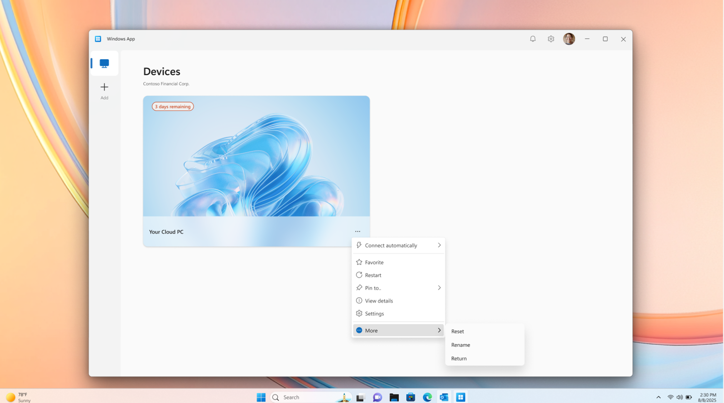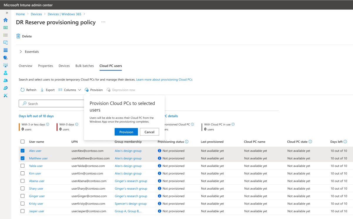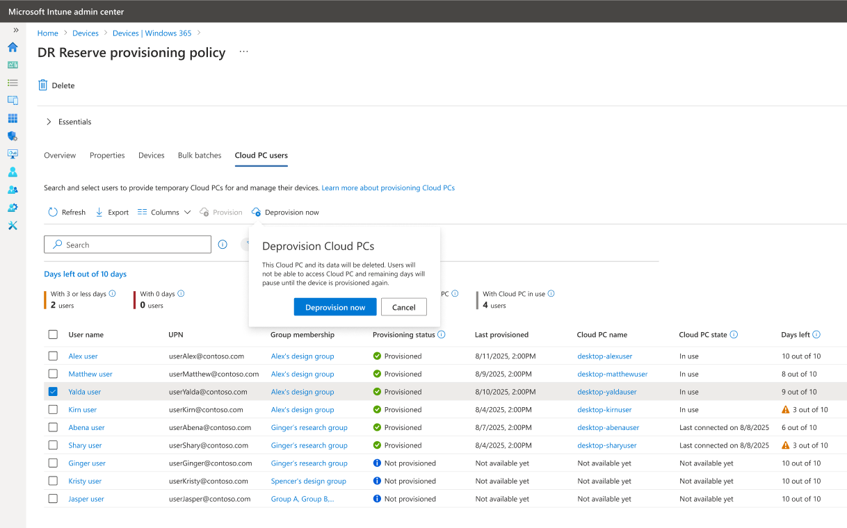 快速恢复生产力:管理员可在用户设备故障时,迅速部署已预配置的云端 PC,内含 Microsoft 365 应用、Intune 策略及企业安全设置,确保员工可从备用设备及时恢复工作。