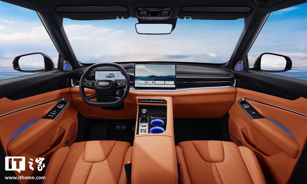 新车配备了悬浮式矩形中控屏,以及水晶挡把并保留部分实体按键,整体采用了橘色 + 黑色的搭配设计。中控屏分辨率为 1920×1080,全系标配吉利最新版 Flyme Auto 1.8 系统,支持小窗同屏多任务模式、手势控制、全语音控制、高德地图 810 版以及 AI 智能交互等,同时全系标配手机 App 远程控制,屏幕下方还配有 50W 无线充电面板。该车主驾座椅支持 6 向电动调节,副驾为 4 向,前排座椅支持 3 档加热、通风。