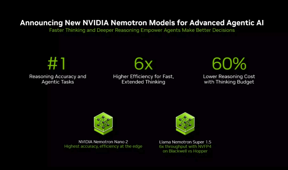 在此理念下,NVIDIA 推出了全新的 Nemotron 模型家族。据 NVIDIA 介绍,Nemotron 在推理准确性与自主性任务方面表现卓越,排名领先,相比同类模型效率提高了 6 倍,同时成本降低了 60%。