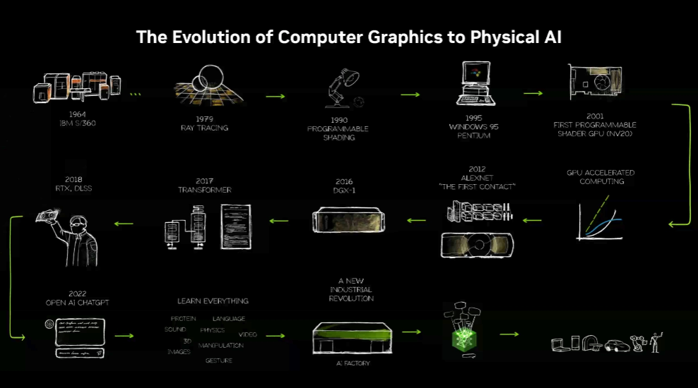 大会开场,NVIDIA 回顾了计算机图形学的漫长发展历程,从 1964 年 IBM S / 360 简单的图形处理,到 2022 年 OpenAI ChatGPT 掀起的人工智能变革浪潮,技术的演进日新月异。NVIDIA 明确指出,继感知 AI、生成式 AI 和智能体 AI 之后,物理 AI 将成为下一个万亿级美元的市场。所谓物理 AI,即能够理解物理定律并与现实世界交互的智能实体系统,其应用前景涵盖工厂自动化、自动驾驶汽车、智能机器人等多个领域。