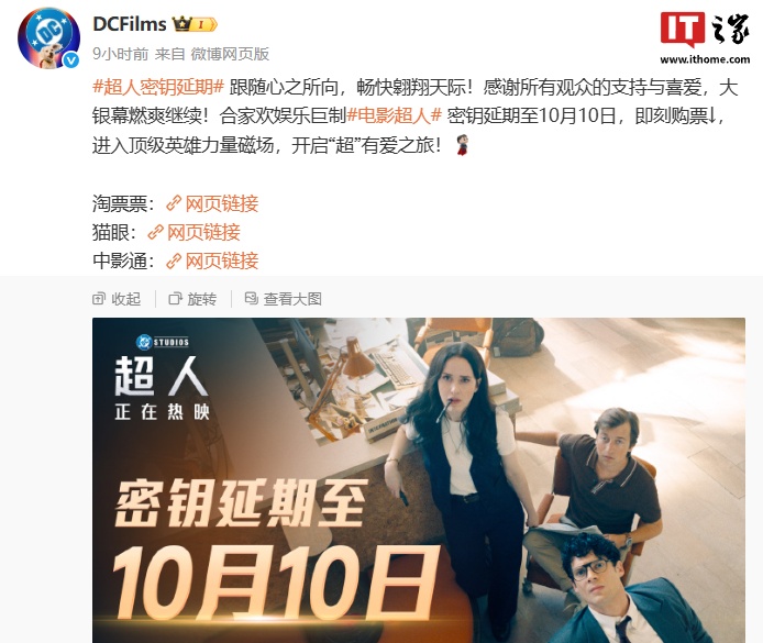 IT之家 8 月 12 日消息,DC 电影官方微博今日宣布,DCU 首作《超人》内地密钥将延期至 10 月 10 日。