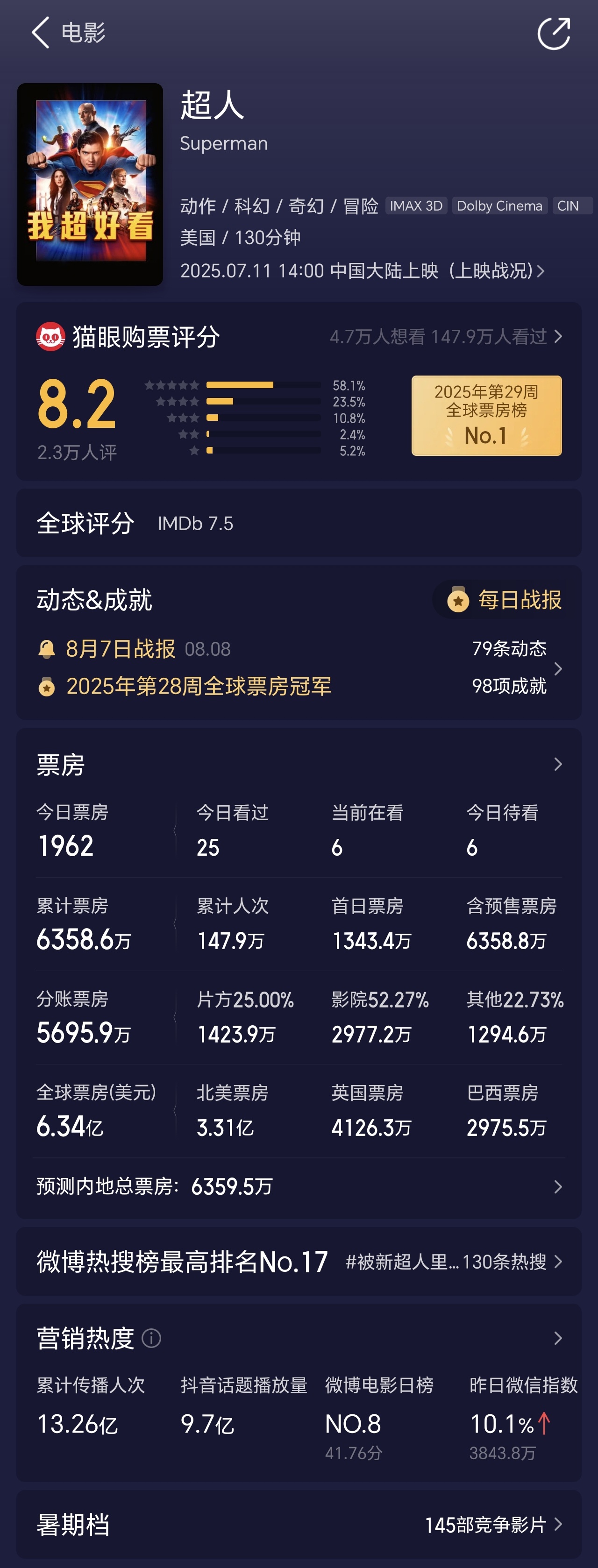 据猫眼专业版数据,DCU 电影《超人》内地累计票房破 6358.6 万元、全球票房破 6.34 亿美元(IT之家注:现汇率约合 45.59 亿元人民币),北美市场已超过扎导 DCEU 时代的《蝙蝠侠大战超人:正义黎明》,创造超人系列电影北美最高票房纪录。