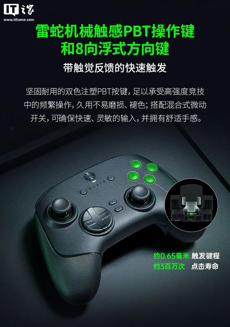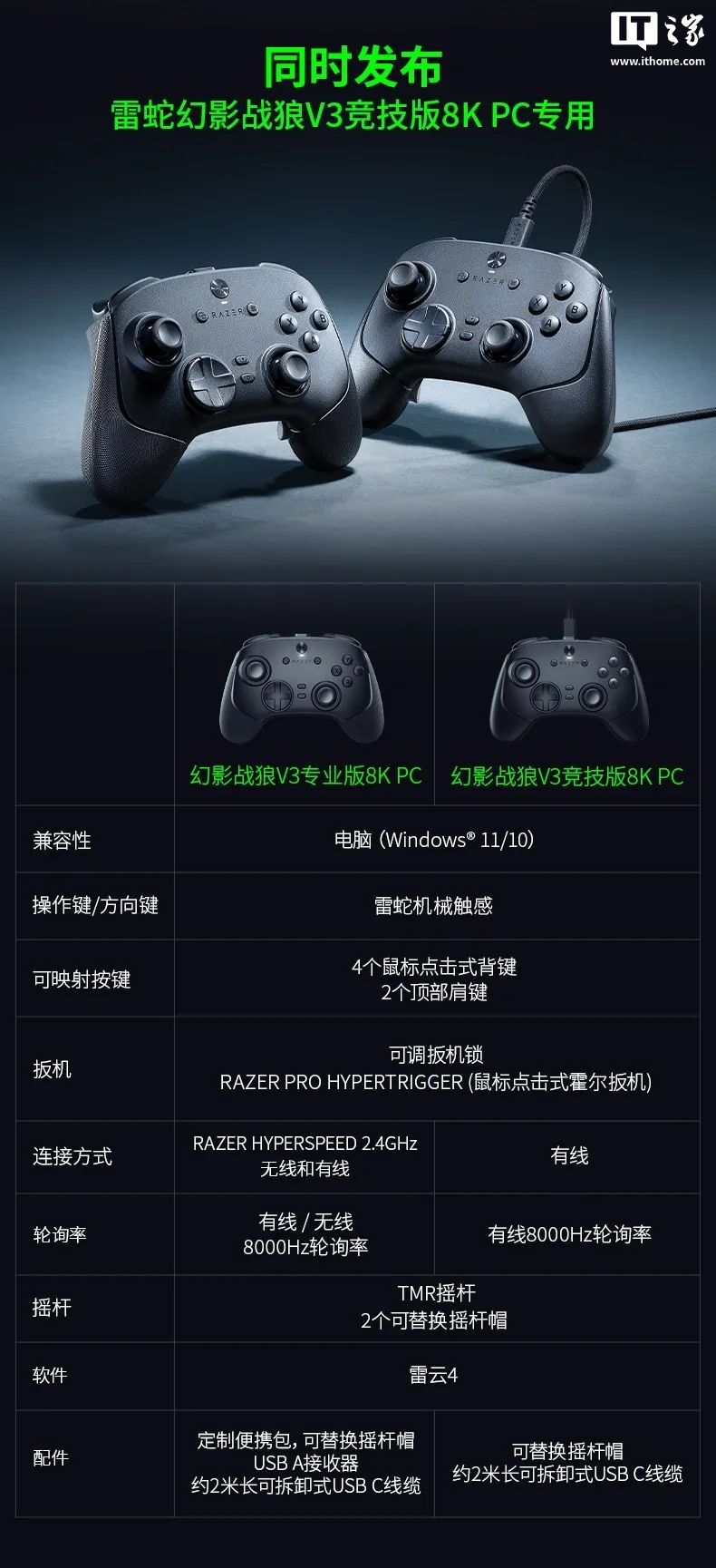 此外,雷蛇还同时发布了幻影战狼 V3 竞技版 8K PC 专用手柄。IT之家附两款新品手柄参数信息如下: