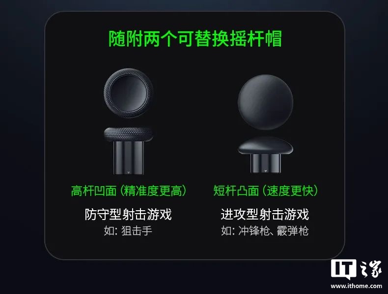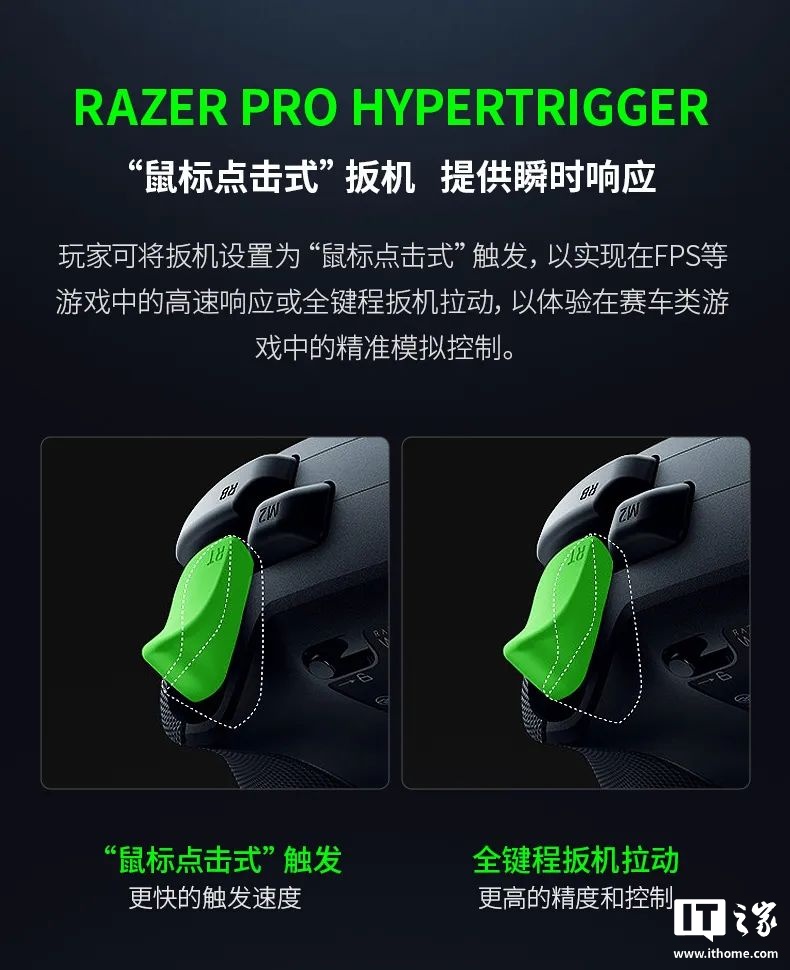 雷蛇幻影战狼 V3 专业版 8K PC 手柄支持“鼠标点击式”触发和全键程扳机拉动,玩家将手柄扳机设置为“鼠标点击式”触发,可实现在 FPS 等游戏中的高速响应;设置为全键程扳机拉动,可体验在赛车类游戏的精准模拟控制。手柄还配备高精度防漂移 TMR 摇杆,随附 2 个替换摇杆帽,可对手柄进行个性化调整。