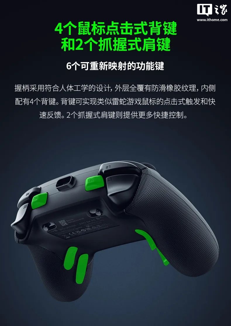 据介绍,雷蛇幻影战狼 V3 专业版 8K PC 手柄支持 8KHz HyperPolling 技术,具备原生 8000Hz 轮询率;握柄采用符合人体工学的设计,外层全覆有防滑橡胶纹理,内侧配有 4 个背键。背键可实现类似雷蛇游戏鼠标的点击式触发和快速反馈,2 个抓握式肩键则提供更多快捷控制。