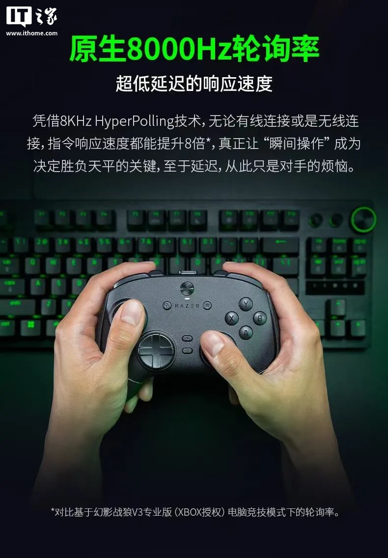IT之家 8 月 12 日消息,雷蛇幻影战狼 V3 专业版 8K PC 专用手柄今晚正式发布,新品拥有 8000Hz 轮询率、支持双模连接、配备可调扳机锁 RAZER PRO HYPERTRIGGER(鼠标点击式霍尔扳机),定价 1499 元。