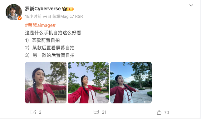 此前,荣耀首席影像工程师罗巍 Cyberverse 在微博上发布了多组人像自拍对比照片,并表示它们分别来自某款前置自拍、某款后置看屏幕自拍、另一款的后置盲自拍,这其中出现后置看屏幕自拍,显然就是折叠屏手机了,联系上面的爆料消息,应该就是荣耀 Magic V Flip2 的人像拍照样张。