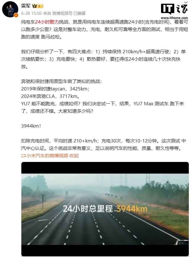 而在小鹏之前,小米 YU7 Max 测试车今年 6 月曾进行一场纯电车 24 小时耐力挑战,就是用纯电车连续超高速跑 24 小时(含充电时间),看看可以跑多少公里。其最终成绩为 3944km,扣除充电时间,平均时速 210+km/h;充电 30 次,每次 10-12 分钟,这次测试获中汽中心认证。