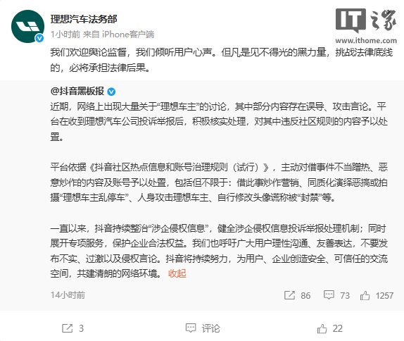 IT之家 8 月 13 日消息,抖音昨日发布公告,宣布对网上关于“理想车主”部分误导、攻击言论进行处理。抖音表示,近期,网络上出现大量关于“理想车主”的讨论,其中部分内容存在误导、攻击言论。平台在收到理想汽车公司投诉举报后,积极核实处理,对其中违反社区规则的内容予以处置。