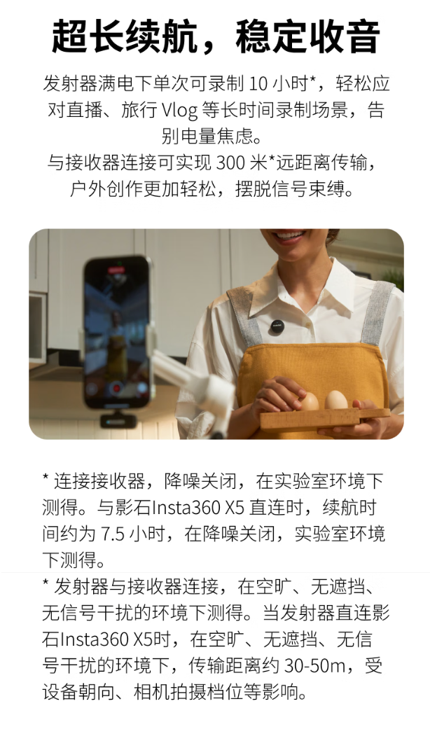 据影石介绍,这款麦克风采用领夹式设计,满电下单次可录制 10 小时,与全景相机 / 运动相机直连时传输距离可达 5-30 米,其自身重量为 7.9g,号称可“夹衣不晃”,适合 Vlog、单兵创作、直播、口播等场景。