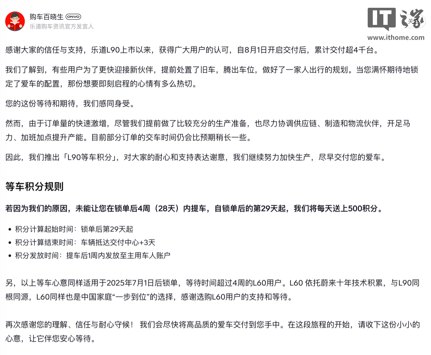 IT之家 8 月 13 日消息,乐道汽车今天通过官方 App 宣布,尽管此前已经做了“比较充分”的生产准备并尽力协调供应链、制造和物流伙伴,开足马力加班加点提产,但目前部分订单交车时间仍会比预期稍长。因此,官方推出“L90 等车积分”。