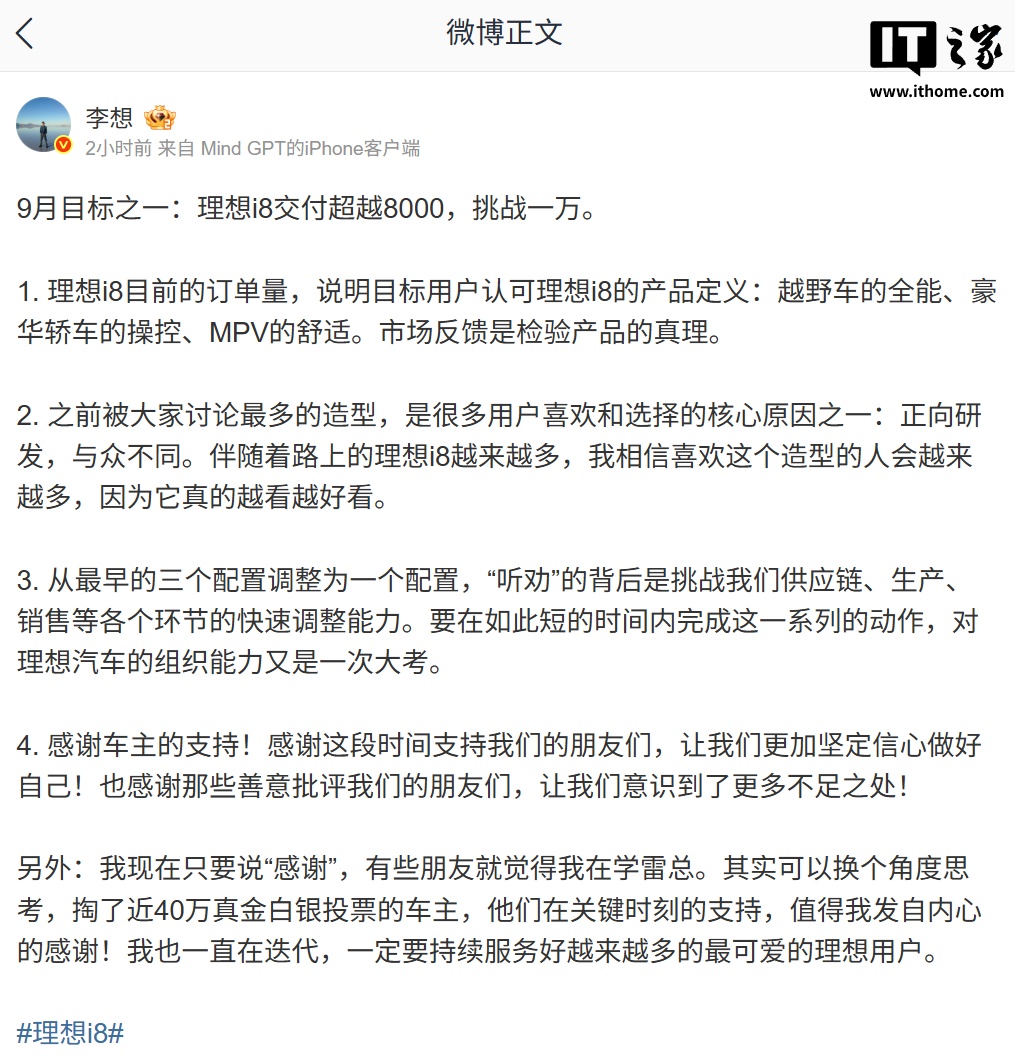 李想在文中首先重复了理想汽车上午“i8 汽车定下了 9 月交付量超越 8000 台、挑战 10000 台”的目标,并谈到了 i8 的配置、车主的选择,IT之家附全文如下: