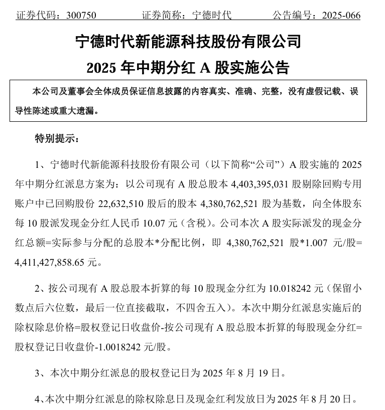 IT之家 8 月 13 日消息,宁德时代今日发布公告,公司 A 股实施的 2025 年中期分红派息方案为: