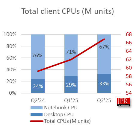 IT之家注意到,数据显示客户端 CPU 出货量由第一季度的约 6200 万颗增至第二季度的 6700 多万颗,其中桌面处理器占比约 33%,移动处理器约 67%。