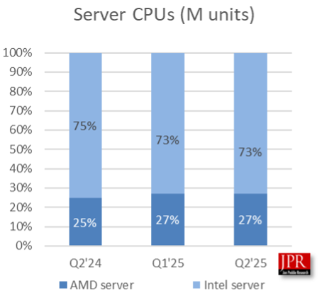 2025 年第二季度,客户端 CPU 出货量环比增长 7.9%,同比增长 13%;同期服务器 CPU 出货量同比增长 22%,环比小幅上升 0.6%。