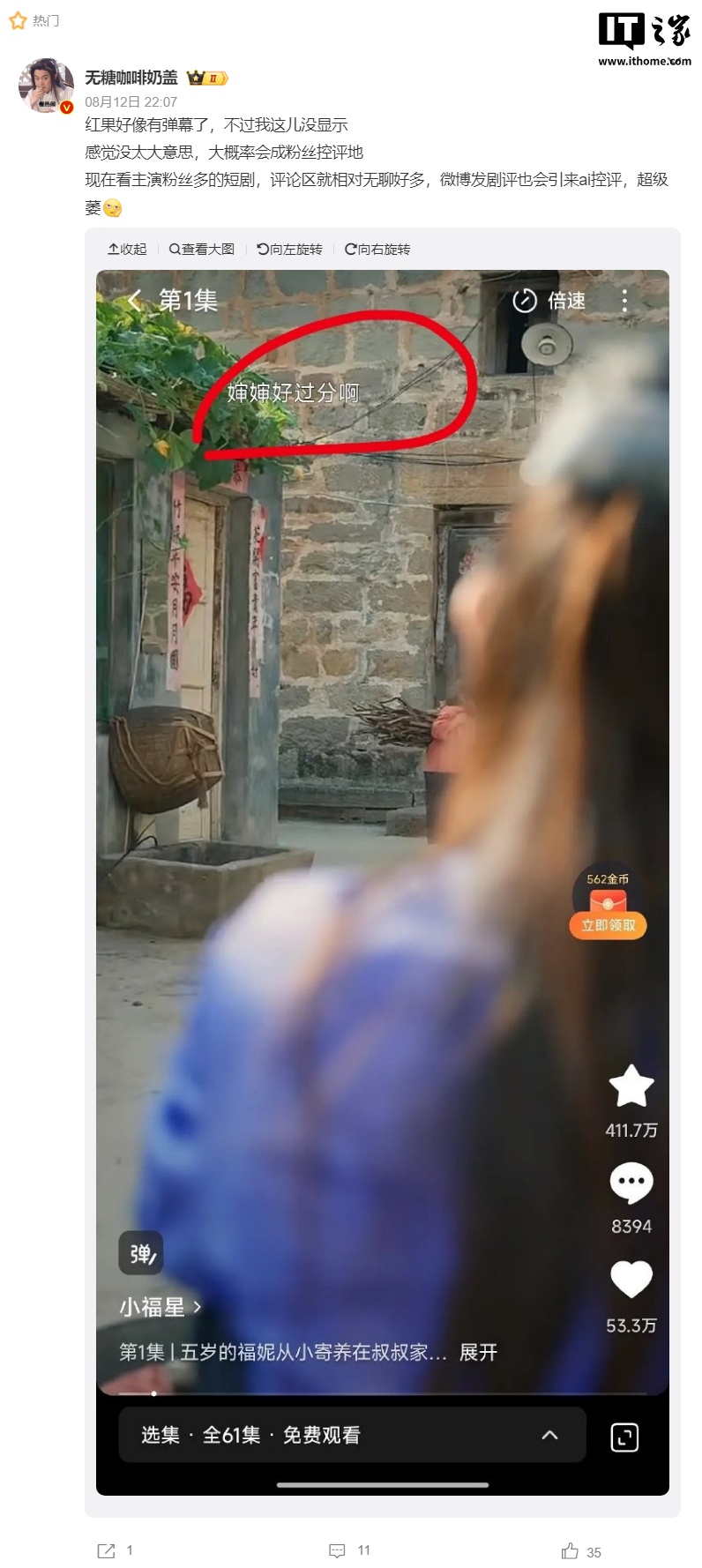 IT之家 8 月 13 日消息,据新腕儿今日报道,红果短剧出现弹幕功能,目前仅在小范围内测试,尚未全部开放。