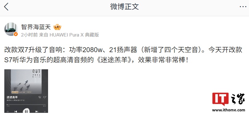 根据智界产品总监 @智界海蓝天 分享,鸿蒙智行改款双 7 车型对音响进行了升级,拥有 21 扬声器、功率达 2080W,其中新增了四个天空音。