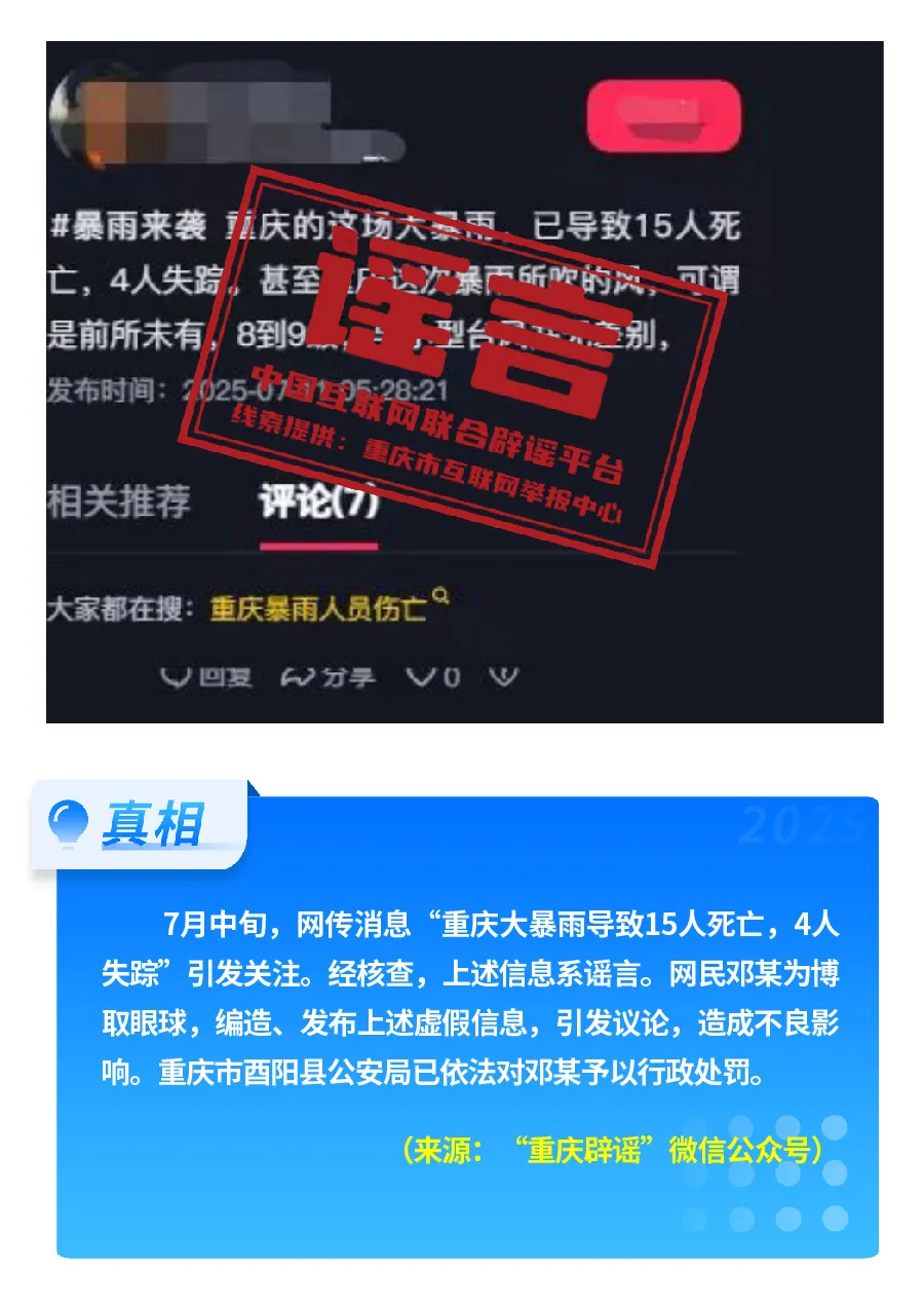 近期,网上接连出现发布虚假“警情通报”的恶性造谣传谣案件,炮制传播“昆明驾车撞人案 131 人死亡”“杭州自来水接入粪水”及涉释永信虚假“警情通报”,模仿“蓝底白字”格式,杜撰耸人听闻细节,损害政府公信力,严重扰乱社会秩序。“院士预测广东将发生 8 级以上大地震”公然伪造专家聊天截图,谎报地震预警。还有造谣者借盛夏高温酷暑与洪涝灾害,编造“安徽淮北、山东泰安等地多人因高温死亡”“重庆大暴雨导致 15 人死亡、4 人失踪”等谣言,蹭炒热点、煽动情绪。
