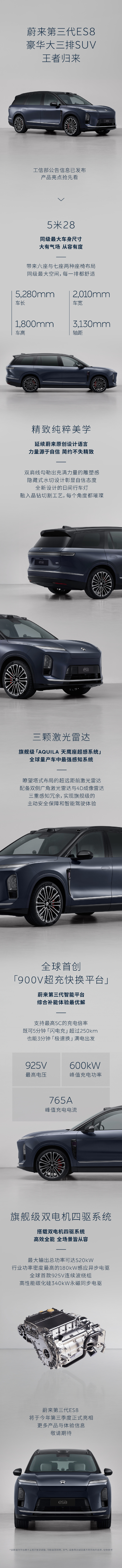 全新蔚来 ES8 的长宽高分别为 5280×2010×1800mm,轴距 3130mm,相比现款车型有显著提升。新车搭载了三颗激光雷达的旗舰级 AQUILA 天鹰座超感系统,采用瞭望塔式布局的超远距前激光雷达,配备双侧广角激光雷达与 4D 成像雷达三重感知冗余,能够实现旗舰级的主动安全保障和智能驾驶体验。