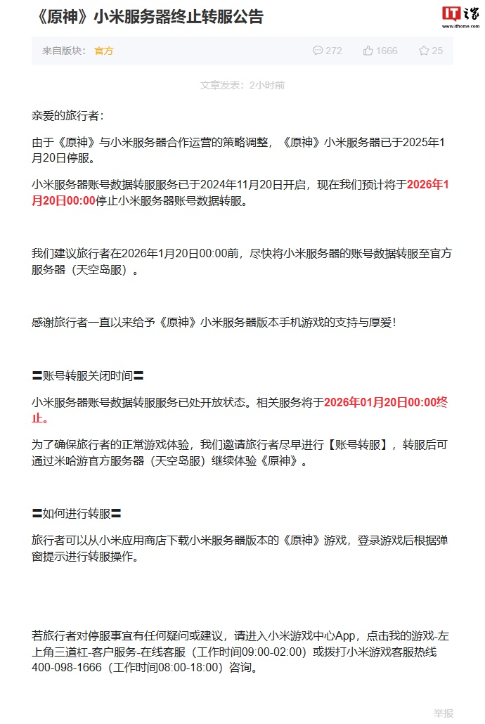 IT之家 8 月 14 日消息,米哈游《原神》官方今日发布“小米服务器终止转服公告”。公告提到,由于《原神》与小米服务器合作运营的策略调整,《原神》小米服务器已于 2025 年 1 月 20 日停服,玩家可转至官服(天空岛服),预计将于 2026 年 1 月 20 日 00:00 停止小米服务器账号数据转服。