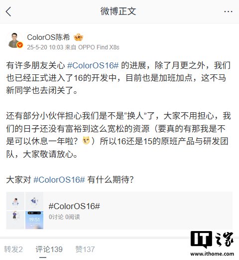 综合IT之家此前报道,今年 5 月,ColorOS 设计总监陈希透露,ColorOS 16 已进入开发中,延续 ColorOS 15 原班产品与研发团队。