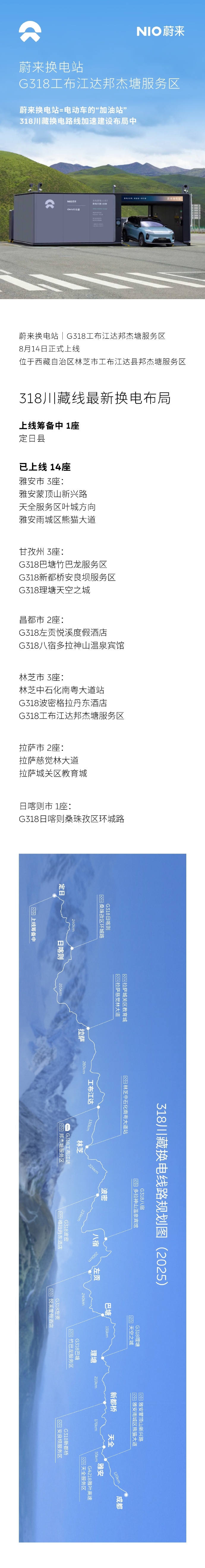 IT之家注意到,蔚来创始人、董事长、CEO 李斌此前宣布,8 月 16 日,G318 川藏换电路线就将全线贯通。据此前官方介绍,蔚来将以 15 座换电站贯通 G318 川藏线,开蔚来、乐道,全程换电到珠峰。7 月 31 日,蔚来在 318 川藏换电线路最后一座换电站开建。