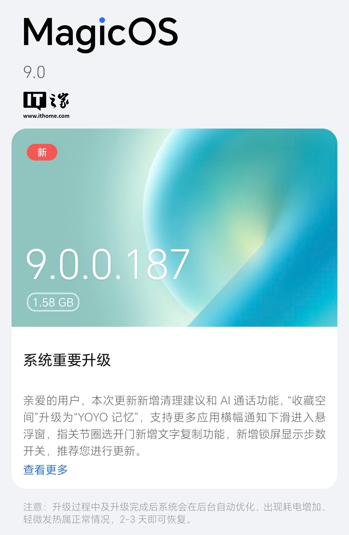 IT之家 8 月 14 日消息,荣耀 Magic7 系列手机今日开启 MagicOS 9.0.0.187 版本升级,系统包大小约 1.58GB。据介绍,本次更新新增清理建议和 AI 通话功能、“收藏空间”升级为“YOYO 记忆”、支持更多应用横幅通知下滑进入悬浮窗、指关节圈选开门新增文字复制功能、新增锁屏显示步数开关等功能。