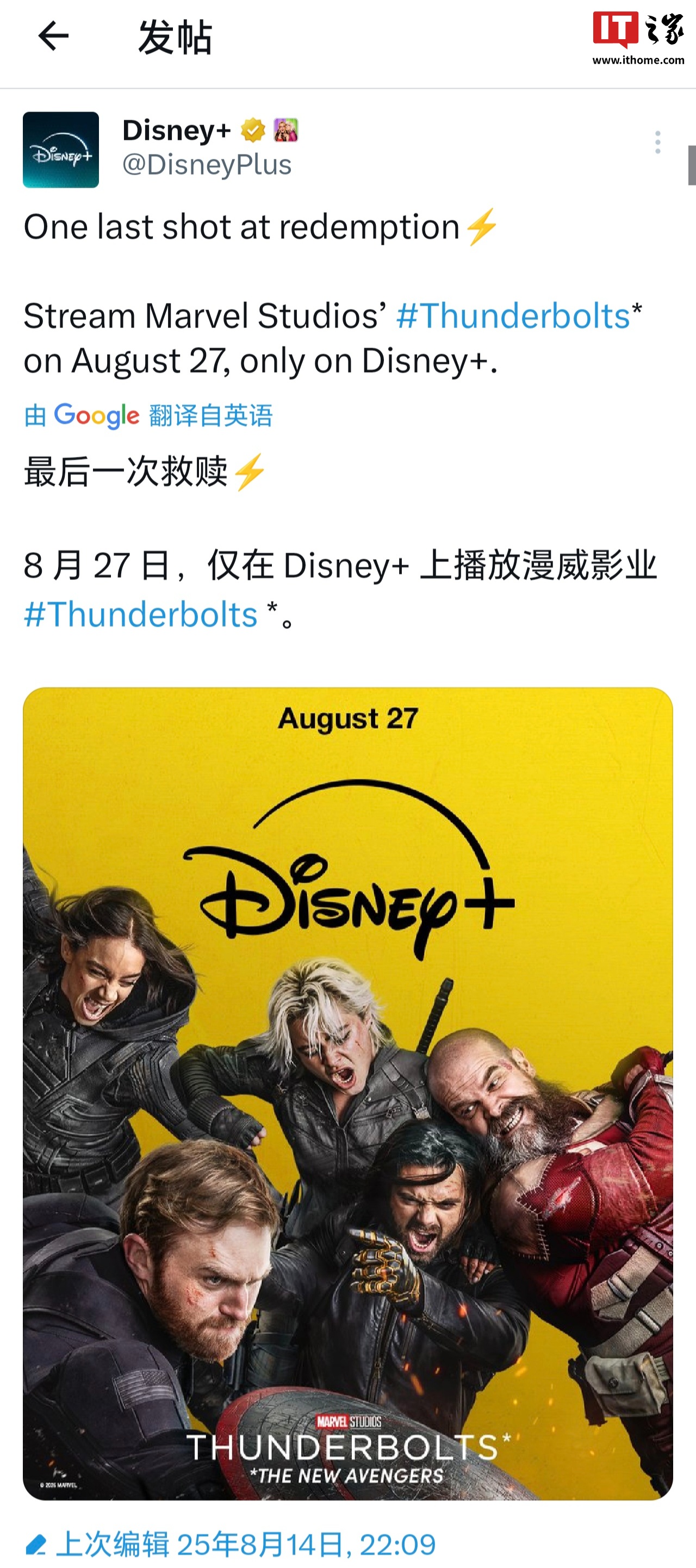 IT之家 8 月 14 日消息,迪士尼官方宣布,漫威超英电影《雷霆特攻队*》(又名《* 新复仇者联盟》)定档 8 月 27 日上线 Disney+ 流媒体平台。值得一提的是,在官方海报中彻底删除了角色“模仿大师”。