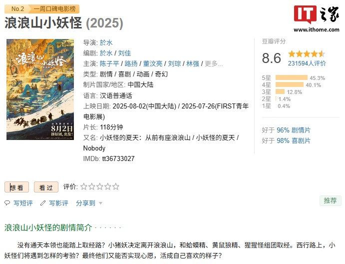 据介绍,本片目前豆瓣评分为 8.6 分,是《中国奇谭》首部动画电影《浪浪山小妖怪》,于 8 月 2 日上映,成为首部登陆 IMAX 的国产 2D 动画电影。