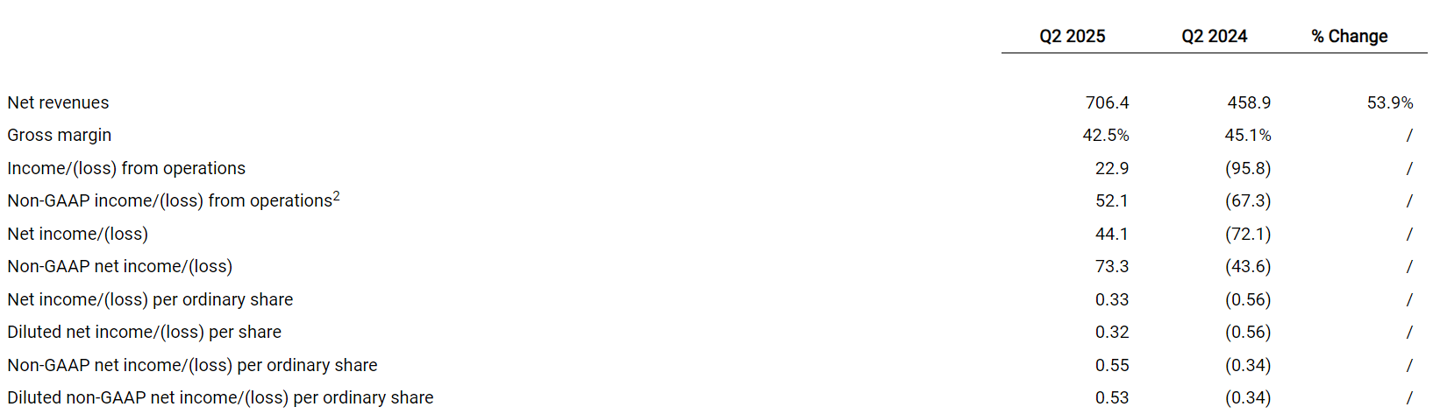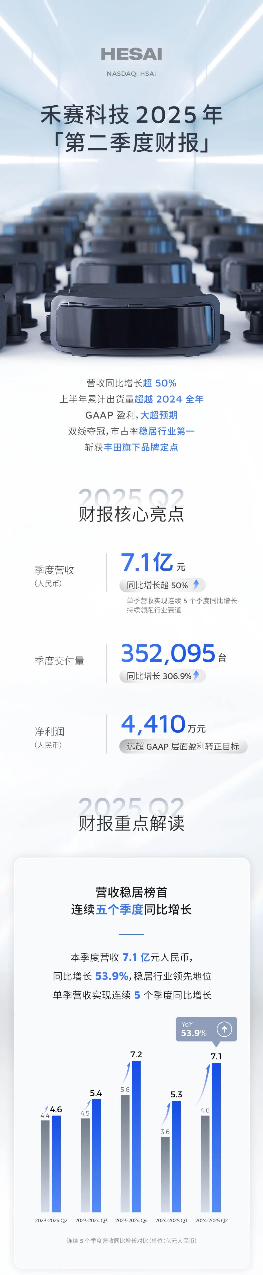 IT之家 8 月 15 日消息,禾赛科技今日公布了 2025 年第二季度未经审计的财务数据。二季度,禾赛实现营收 7.1 亿元人民币,同比增超 50%,净利润突破 4000 万元人民币,远超 GAAP 层面盈利转正目标,去年同期净亏损为 7210 万元。IT之家附业绩表如下: