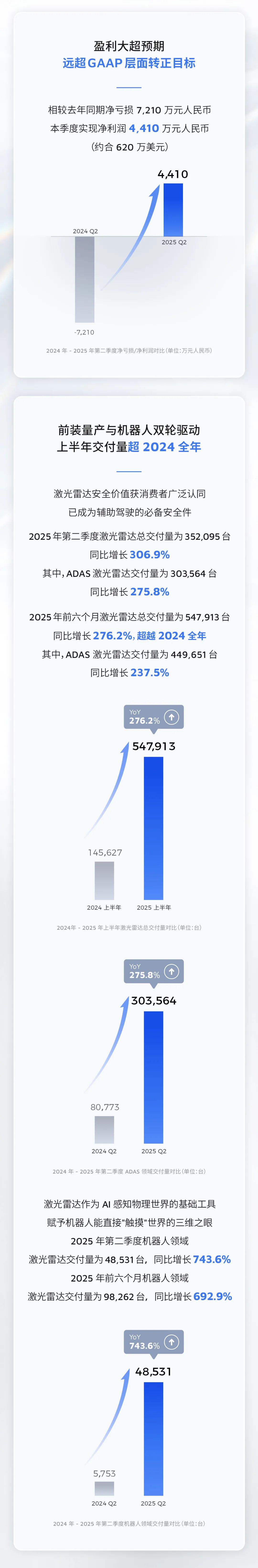 2025 年前六个月,禾赛激光雷达总交付量达 547,913 台,同比增长 276.2%,超越 2024 全年。