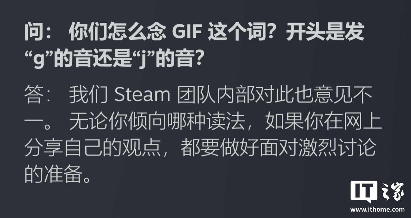 IT之家在公告文末还发现,Valve 开发团队还在博客中幽默提到,团队成员对于“GIF”一词的发音存在分歧,开头是发“g”的音还是“j”的音?