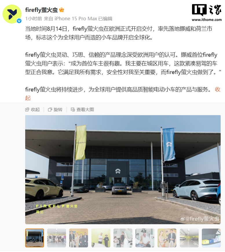 IT之家 8 月 15 日消息,蔚来今天官宣,旗下品牌 firefly 萤火虫汽车正式在欧洲开启交付。