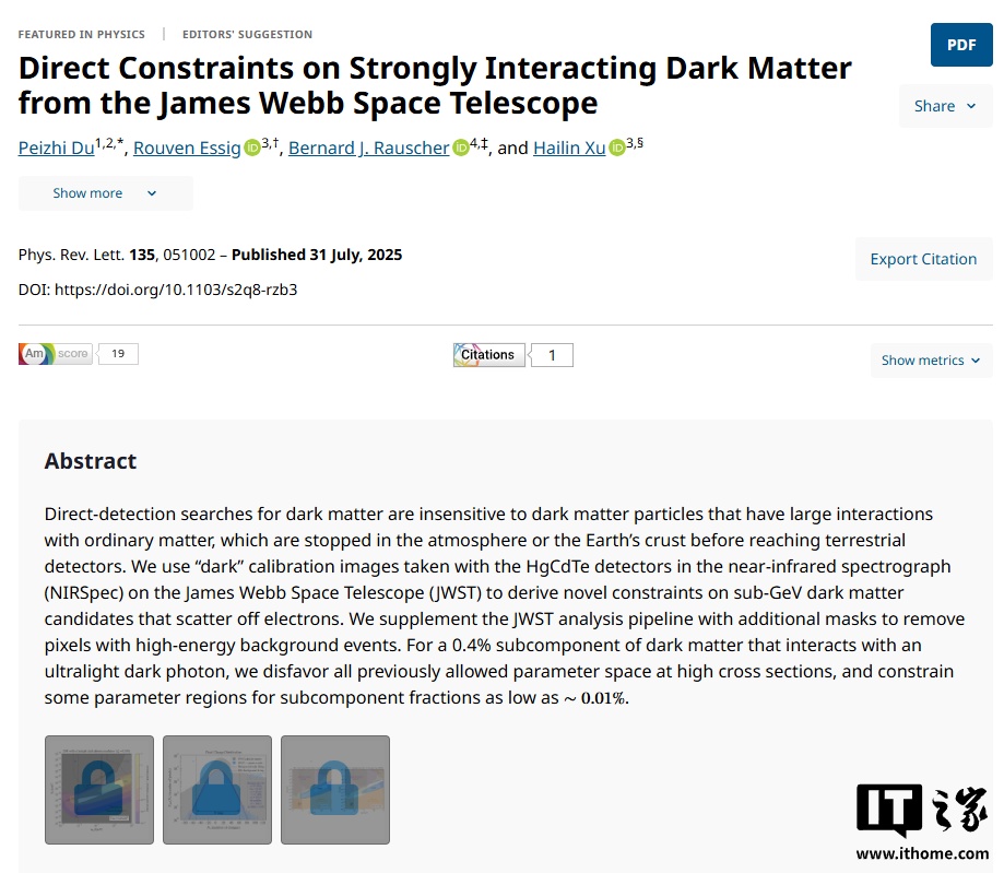 IT之家查询发现,相关成果已于 7 月 31 日发表于《物理评论快报》上,并被选为编辑推荐文章。杜佩之特任研究员为本文共同一作和通讯作者。该项目揭示了空间探测器在强相互作用暗物质探测中的优势和可行性,为未来空间暗物质探测提供了理论基础。