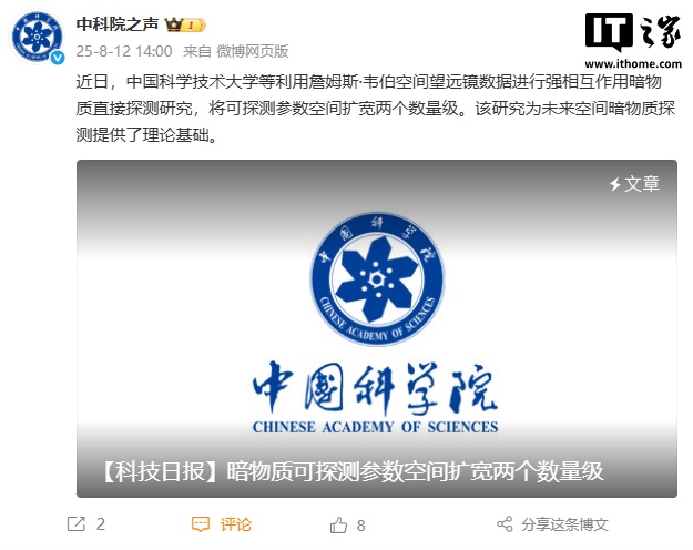 IT之家 8 月 16 日消息,中国科学技术大学宣布,该校自旋磁共振实验室杜佩之特任研究员与国际合作组合作,利用詹姆斯・韦布空间望远镜数据进行强相互作用暗物质直接探测研究,成功克服地面实验的探测局限,将可探测参数空间扩宽两个数量级,为未来空间暗物质探测提供了理论基础。
