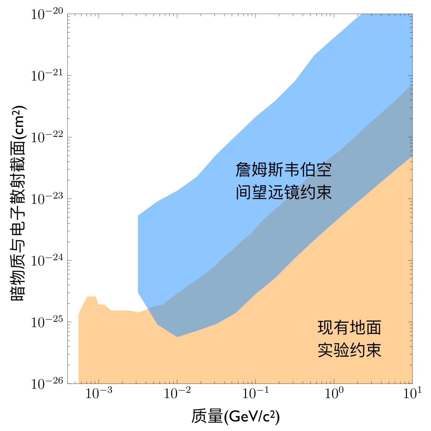 詹姆斯・韦布空间望远镜对强相互作用暗物质参数空间的约束(蓝色区域)。黄色区域为现有地面暗物质直接探测实验约束。