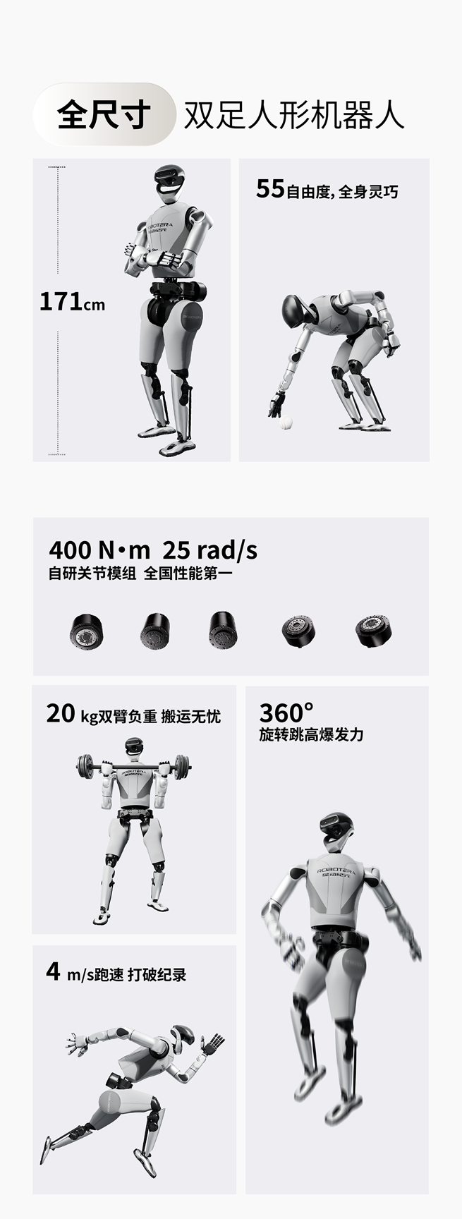 参数方面,这款机器人身高 171cm,有着 7 轴仿人机械臂、12 自由度灵巧手(每秒点击 10 次)、全身 55 个自由度、360° 视野(IT之家注:双目视觉与 3D 激光雷达)、全国性能第一的自研关节模组(扭矩 400 Nm、转速 25 rad / s)、20 kg 双臂负重、360° 旋转跳高爆发力,还有打破纪录的 4m/s 跑速。
